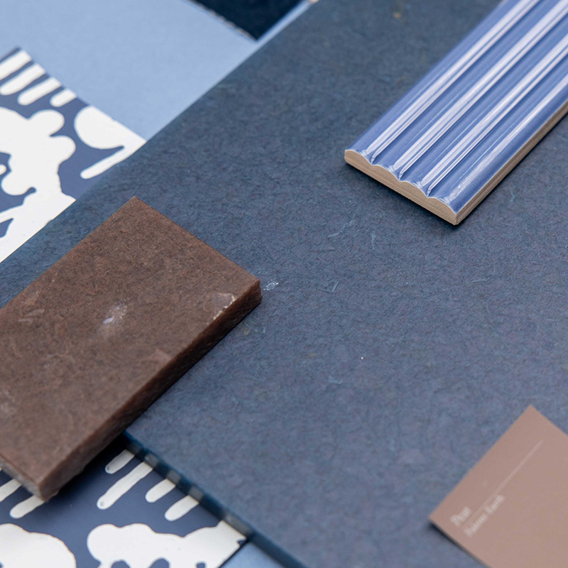 Aber ist inspiriert von den gewundenen Flüssen der walisischen Landschaft. Hergestellt aus recyceltem Kunststoffverpackungsmaterial zeigt dieses Design eine tief marineblaue Farbpalette, in der sandfarbene Akzente sanft an die Oberfläche wirbeln. Das Ergebnis ist eine lebendige Oberfläche, die an fließendes Wasser erinnert.