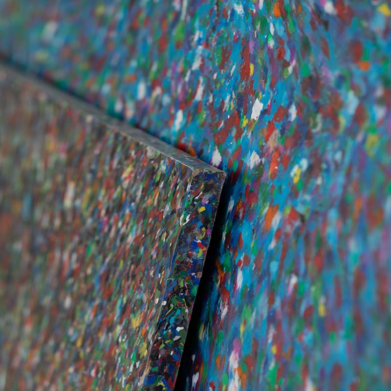 The Artist Collection by GOGO Plastics features vibrant, unique designs reminiscent of paintings. These products are made from recycled bottle caps, giving each sheet a sustainable and creative touch.