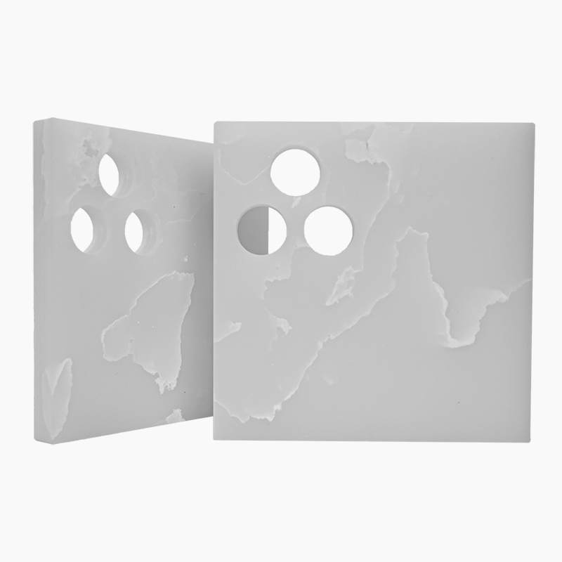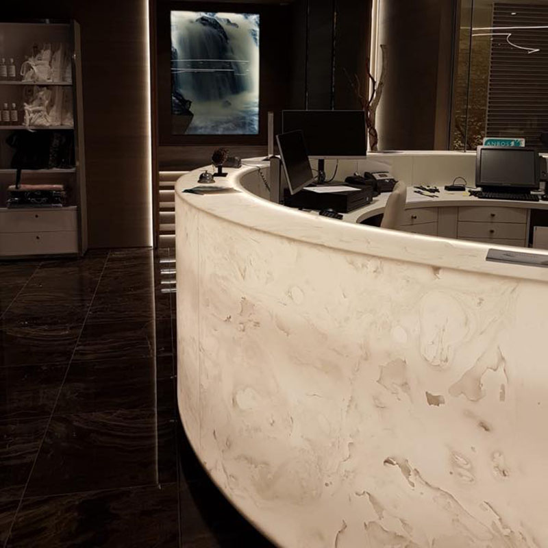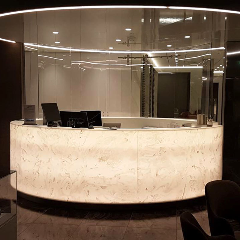 De Translucent Stone-collectie betovert met haar allure en tijdloze schoonheid, met de look & feel van het luxe albaster, statige marmer en de mystiek van onyx. Naast dat het lichter is dan natuursteen is het tevens minder kwetsbaar. De platen stralen een subtiele transparantie uit, waardoor het perfect samengaat met verlichting.
